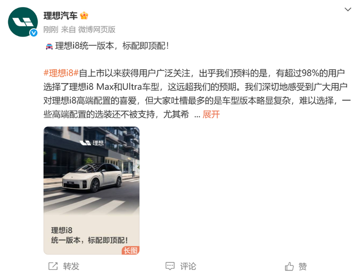 目前,理想i系列纯电SUV已经有两款车型,理想i8已经在7月29日正式上市,在8月5日调整后,理想i8仅有一个配置,售价33.98万元,而理想i6已经官宣将于9月份正式发布并交付。