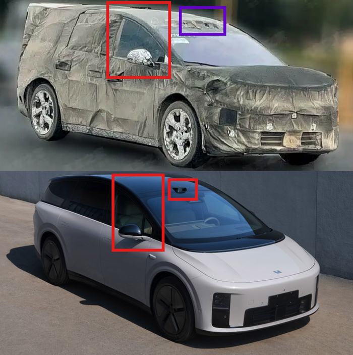 从前部整体来看,疑似理想i9伪装车A柱附近的线条与理想i8也比较接近,另外伪装车车顶处有一块伪装区域,大概率是搭载了激光雷达。