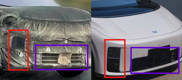 从细节上来看,可以看到疑似理想i9伪装车的大灯组位于前脸下方两侧,中间为横向分隔的进气格栅,这和理想i8上的设计非常相似。