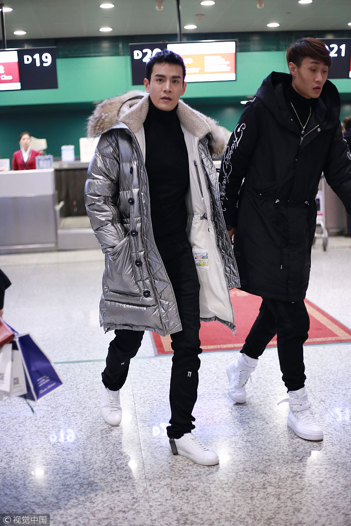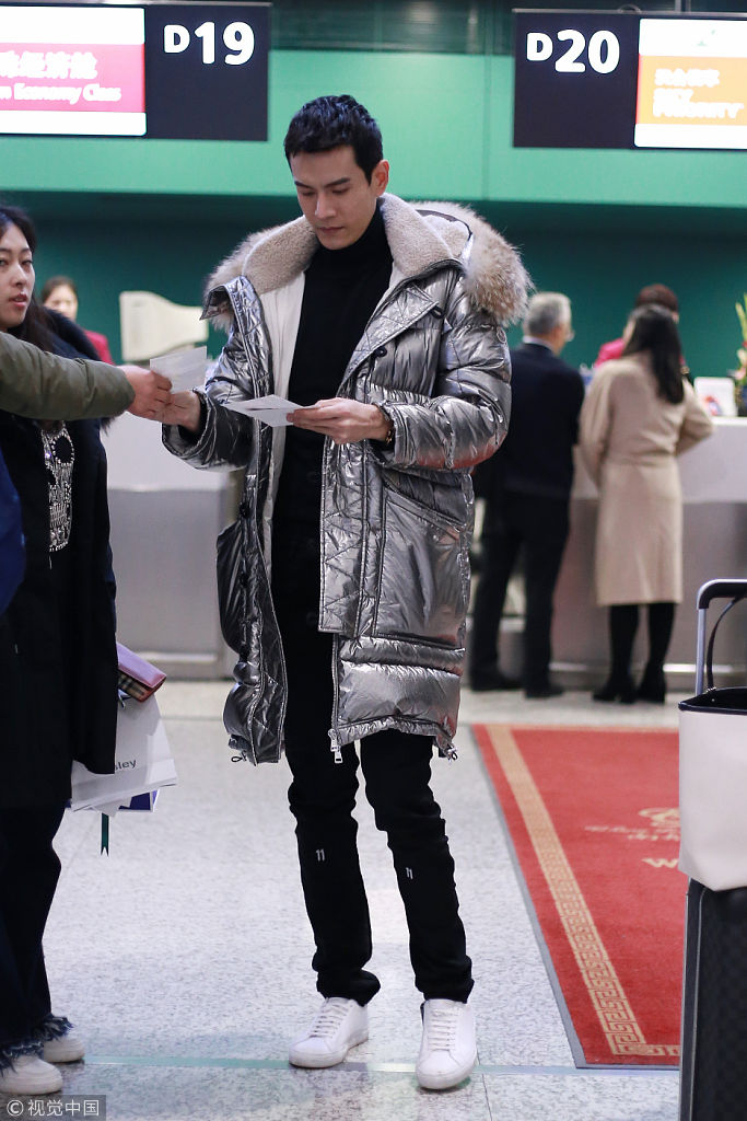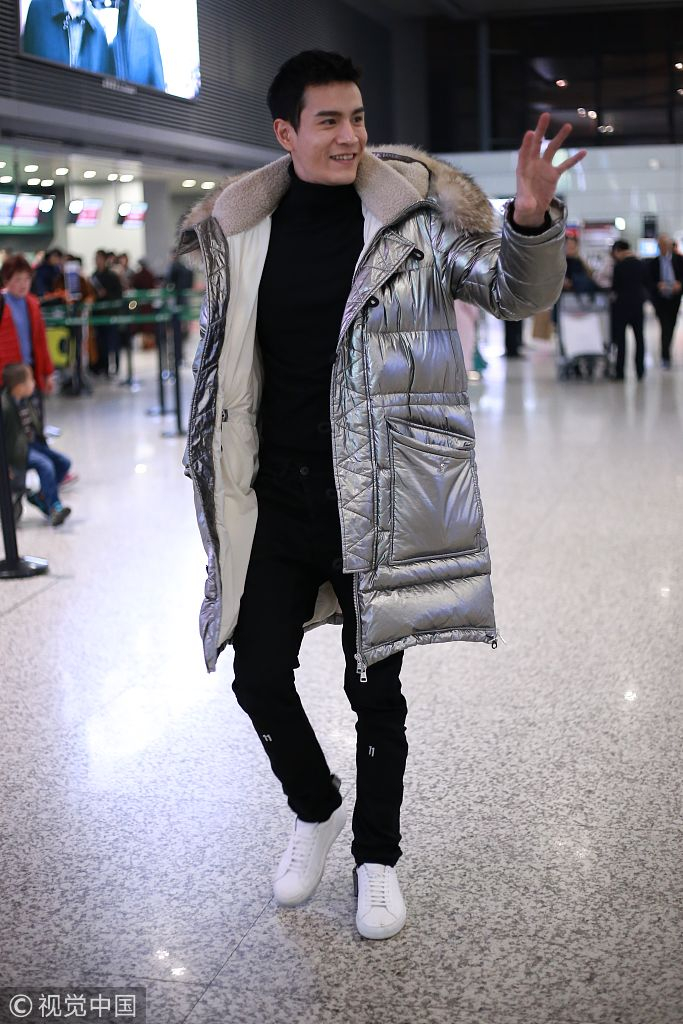 1 / 7 2017年12月30日,上海,经超身着银色羽绒大衣配潮裤现身机场,见镜头大方挥手打招呼亲和力十足。