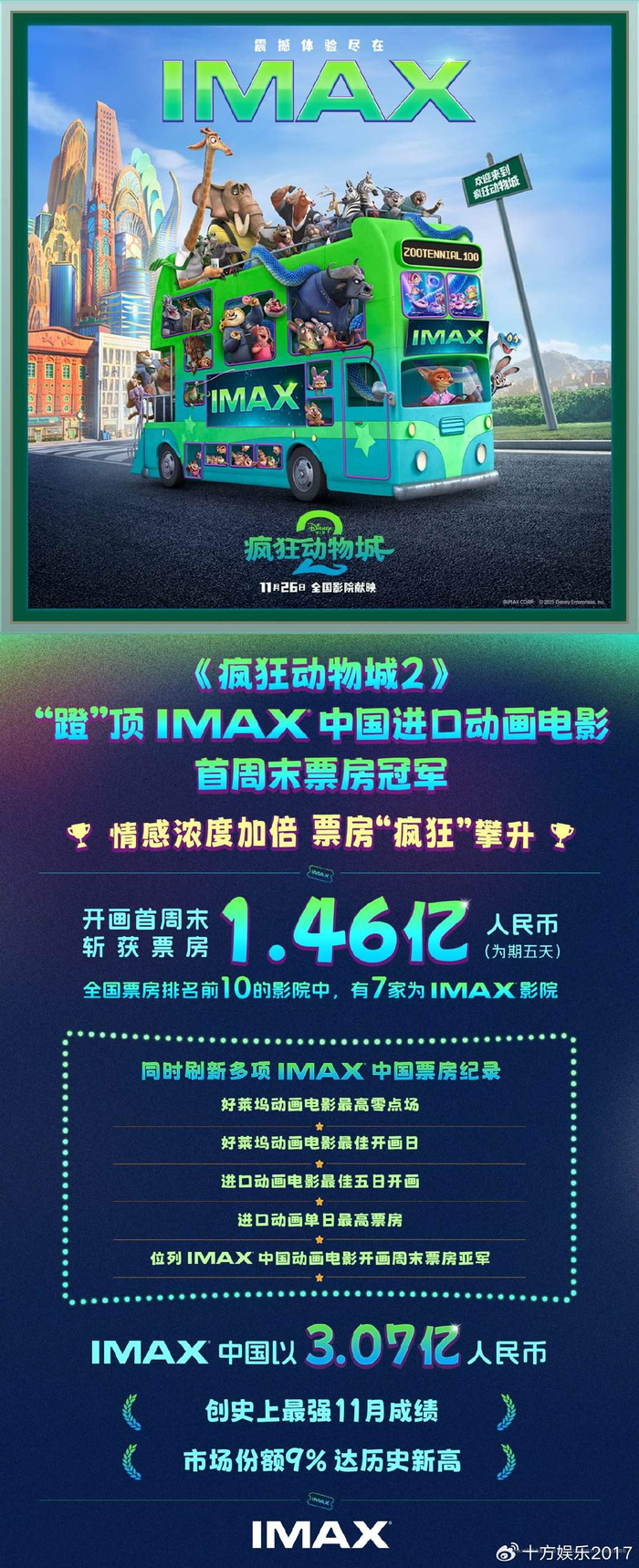 《疯狂动物城2》“蹬”顶IMAX中国进口动画电影首周末票房榜单
