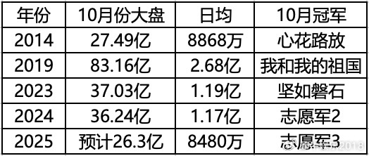 随着2023年、2024年的拉胯表现,国庆档彻底跌落神坛,直接导致了10月份票房仅有30亿+,日均票房来到了1亿出头。就在如此崩盘的基础之上,今年竟然再度迎来了较大规模的下滑,较2024年有着28%的下滑,日均票房已经跌破1亿大关。