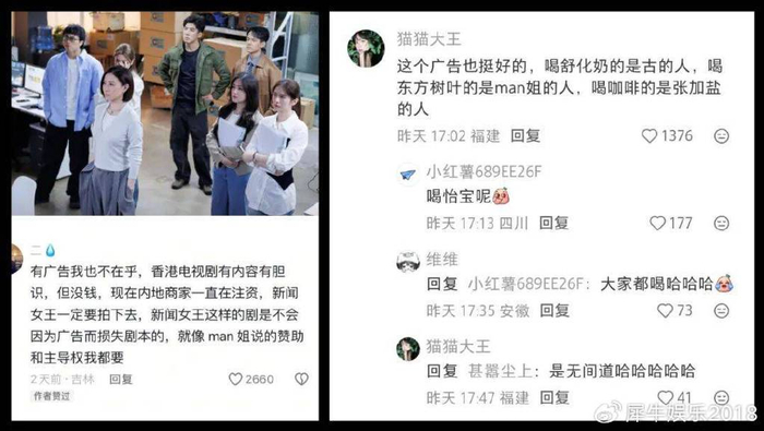 这还没完,近期网友对《新闻女王2》广告的议论热情丝毫不输剧情讨论。在该剧里,每个人气角色、每个权斗阵营都有人手一个的“专属饮品”:古肇华(黄宗泽)一言不合就喝舒化奶,Man姐(佘诗曼)改用东方树叶跟对手干杯,到了手底下爱徒刘艳和PM就只配喝补水啦,更边缘的小卡拉米职员更是只能灌瓶怡宝来缓解备台紧张了!