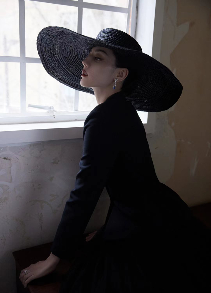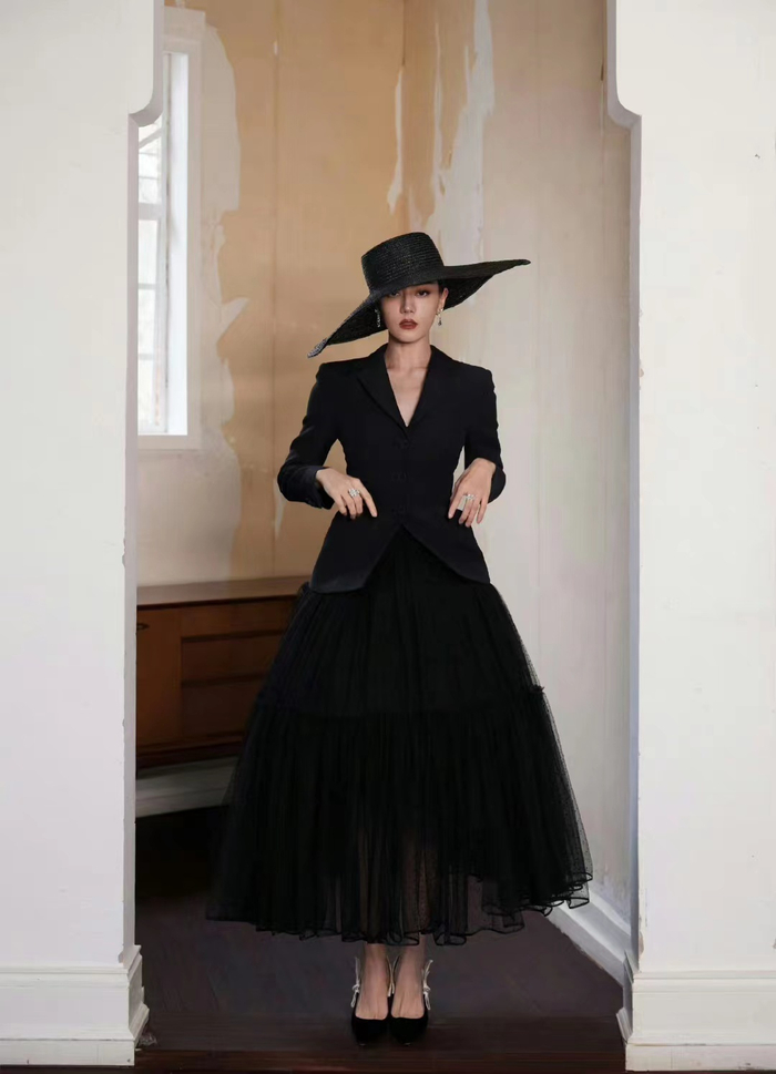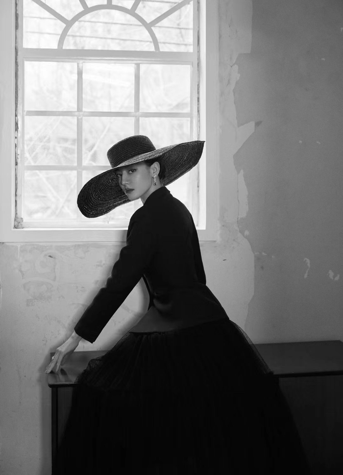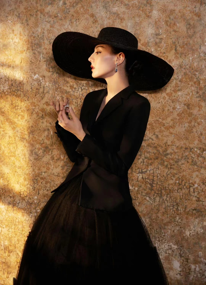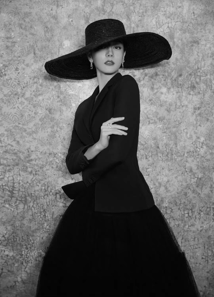 迪丽热巴摩登造型图来了,大帽沿黑色西服纱裙赫本风好足,好美[惊喜]