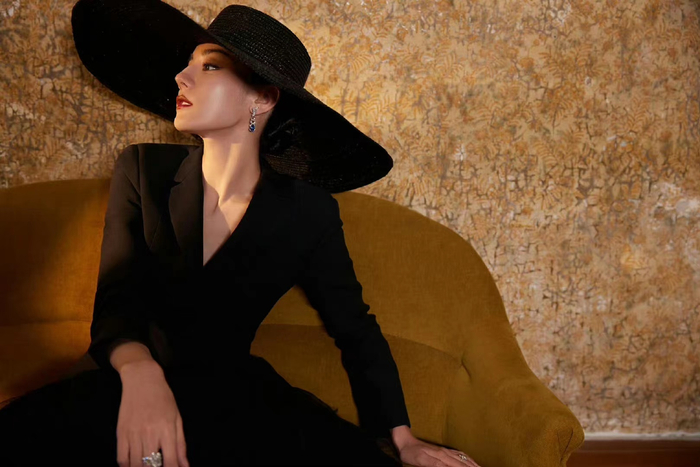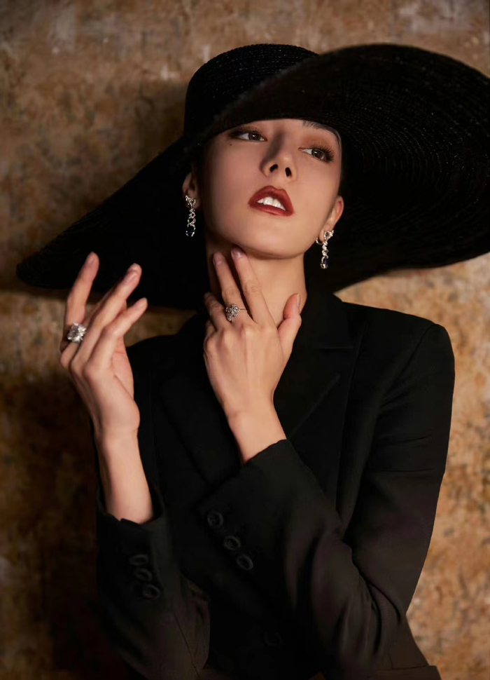 迪丽热巴摩登造型图来了,大帽沿黑色西服纱裙赫本风好足,好美
