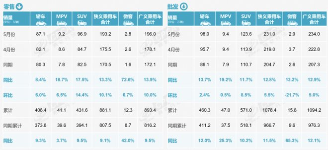 据中国汽车流通协会乘用车市场信息联席分会(以下简称乘联会)统计,5月全国乘用车市场零售销量193.2万辆,同比增长13.3%,环比增长10.1%,狭义乘用车批发销量231万辆,同比增长12.8%,环比增长5.5%。前5个月累计零售销量881.1万辆,同比增长9.1%。累计批发销量1078.4万辆,同比增长11.5%。