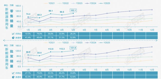 新能源乘用车依旧保持高速增长态势。数据显示,5月新能源乘用车生产、批发和零售分别达到116.7万辆、121.6万辆、102.1万辆,同比分别增长30.2%、33%和28.2%。