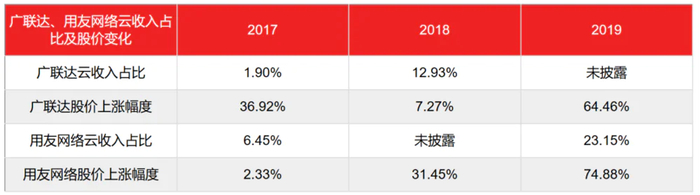 妙投发现,随着云收入占比提升,相关企业的市值也得到了提升。比如:用友网络的云收入占比从2017年的6.45%提升至2019年的23.15%,其2018年、2019年股价上涨幅度分别达到了31.45%、74.88%。