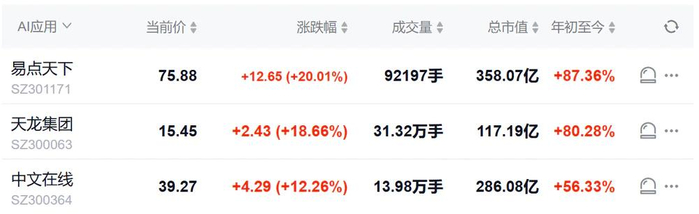 1月12日,AI应用的“易中天”(易点天下、中文在线、天龙集团)均出现20%的涨停。不少媒体开始唱多“新易中天”。