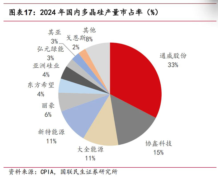 有意思的是,从硅料收储联合体(北京光和谦成科技有限责任公司)的股东名单来看,通威、协鑫、大全能源、新特能源等企业的持股比例与2024年各企业的硅料市占率十分接近。比如:通威的持股比例是30.35%,2024年硅料的市占率为33%。