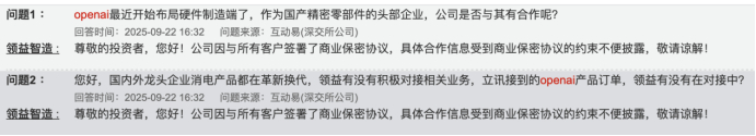 在投资者问答平台上,有投资者曾就立讯精密是否与OpenAI存在合作向领益智造提问。领益智造回应称:“因与所有客户签署了商业保密协议,具体合作信息受到商业保密协议的约束,不便披露。”尽管其未明确承认,但也没有直接否认与OpenAI的合作关系。