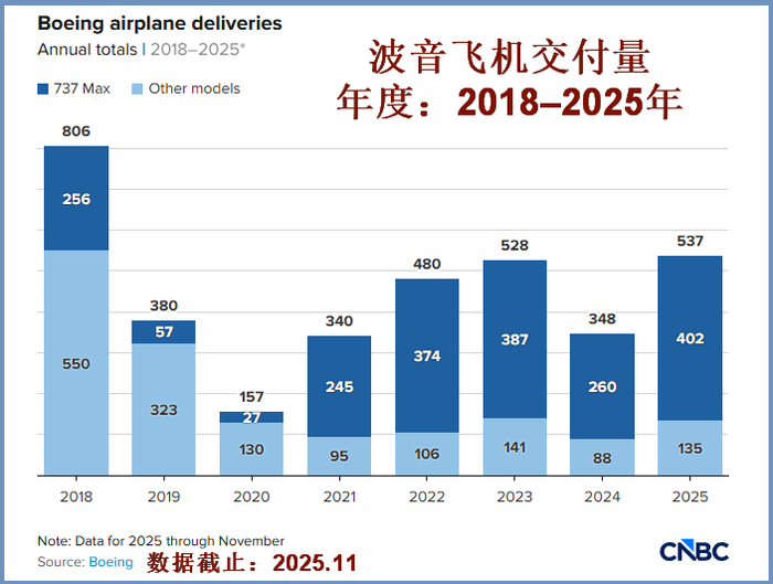 波音飞机最近几年的交付量图表据统计,波音公司在2024年交付了348架飞机,2023年交付了528架。即便如此,2025年的总交付量仍远低于2018年的806架。