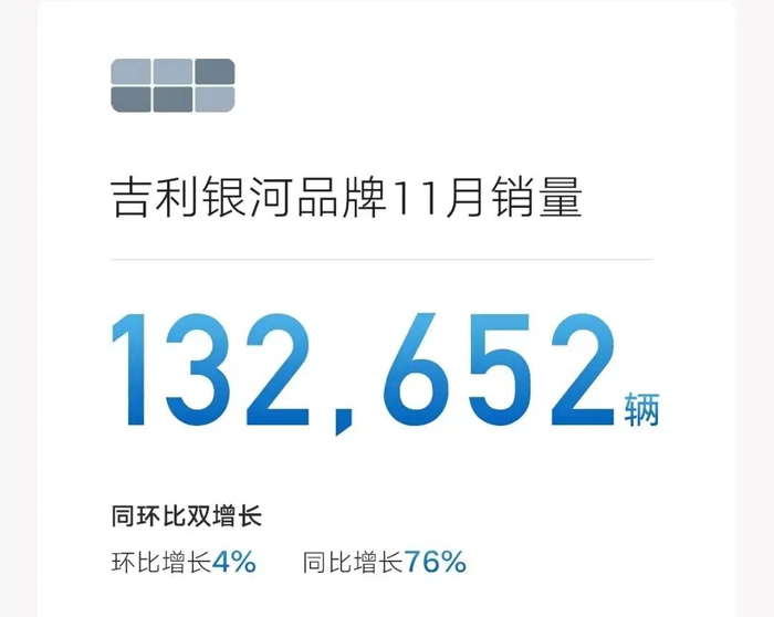 而之所以”仅有“31万辆的单月销量,是因为吉利集团主打亲民实惠定位的新能源品牌是吉利银河品牌,在售车型数量不算特别多,该品牌11月份总销量132,652辆,同比增长76%,按照品牌车型尺寸扩容趋势,吉利银河的销量还会继续强势增长。