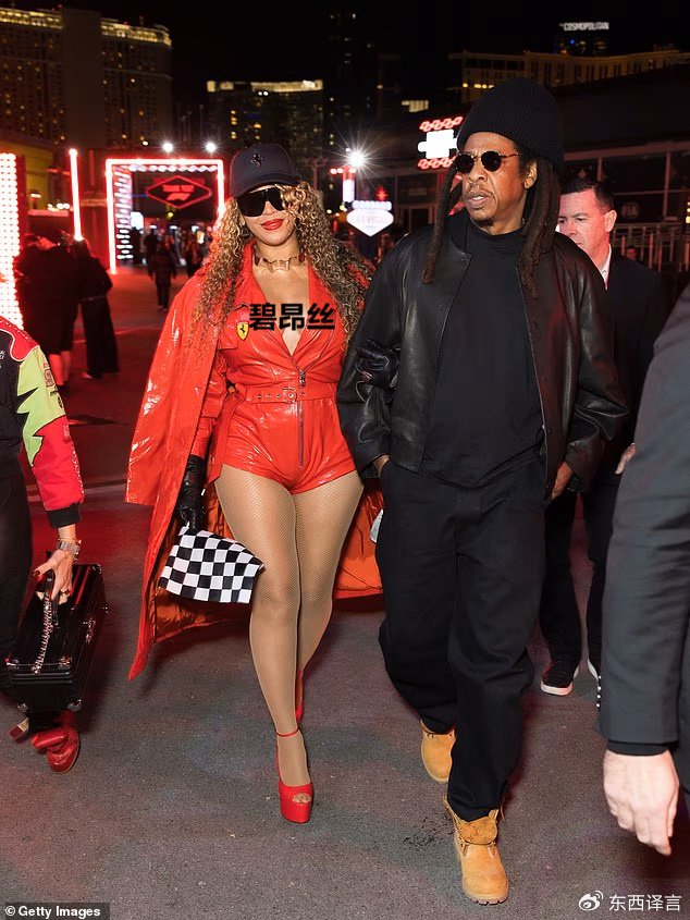 在比赛开始即将前,现年44岁的碧昂丝挽着丈夫Jay-Z入场,身着鲜红色套装的她格外耀眼,显然她是在告诉众人,自己是法拉利的“迷妹”。