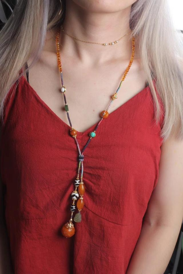 棉麻质衣这样搭配有一种内涵的民族风,老色蜜蜡和天珠作为主珠,非对称的设计方式给人自然放松又不失时尚的感觉,五彩绳简简单单地用蛇结编织起来相比可以给很多同行朋友以参考。