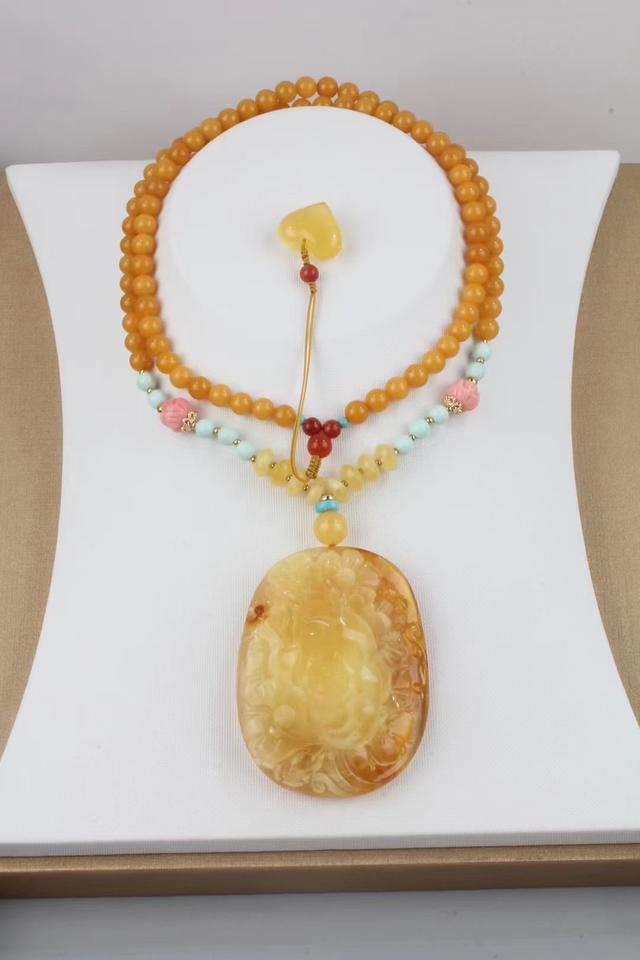 如果你有其它的蜜蜡吊坠也可以这样简单的穿起来,手机拍摄下整体颜色发浅,戴在身上看起来更有味道。