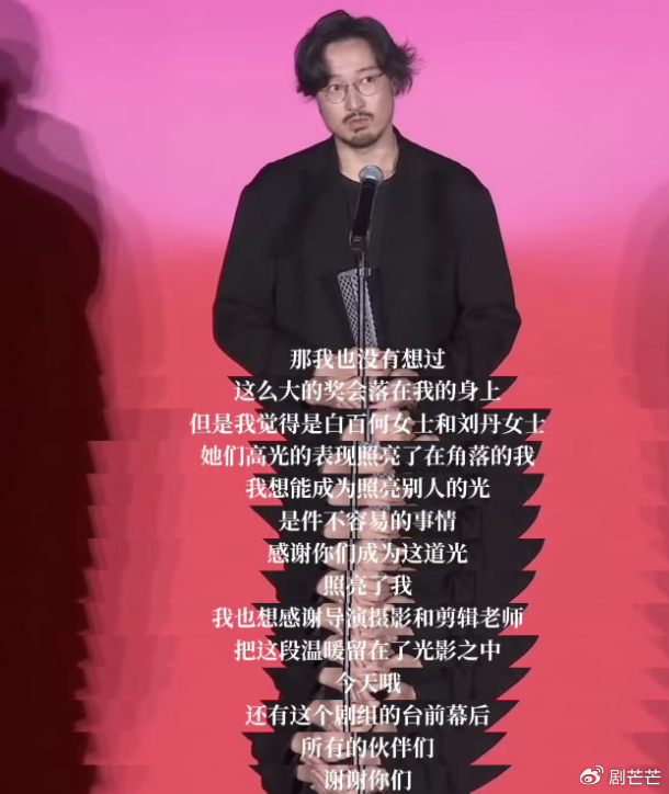 回应的时候,多次表示,自己是借了两个主演的光,借了导演的光,借了环境的光,借了周围一切的光。是他们照亮了我,让我被看见,我没有做什么特别的处理。
