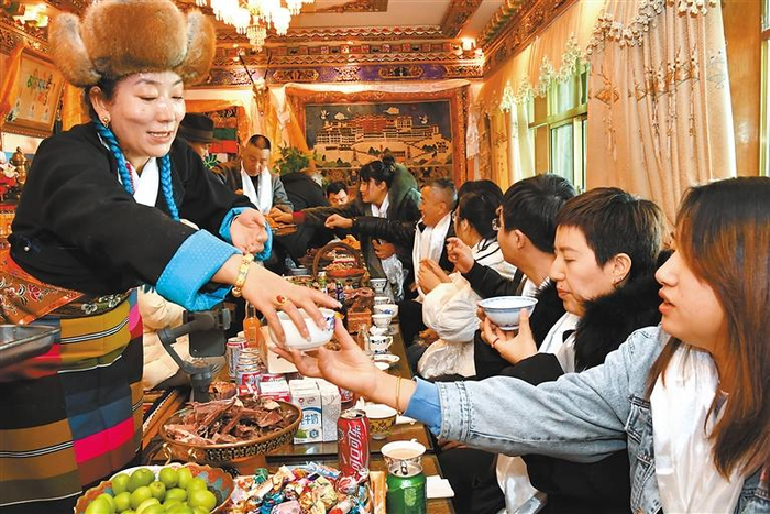 2月21日,藏历新年初一,游客在拉萨市城关区夺底街道维巴村体验藏历新年别样的风俗文化。本报记者 次仁平措 白玛泽旺 摄