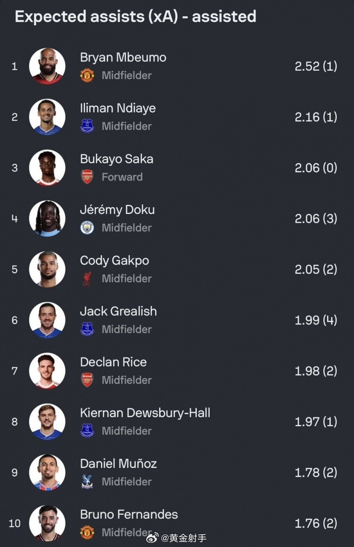 #曼城[超话]# 媒体统计了本赛季球员在英超的预期助攻数据,并列出榜单,姆伯莫预期助攻2.52次居首,恩迪亚耶、萨卡二三位。