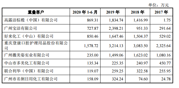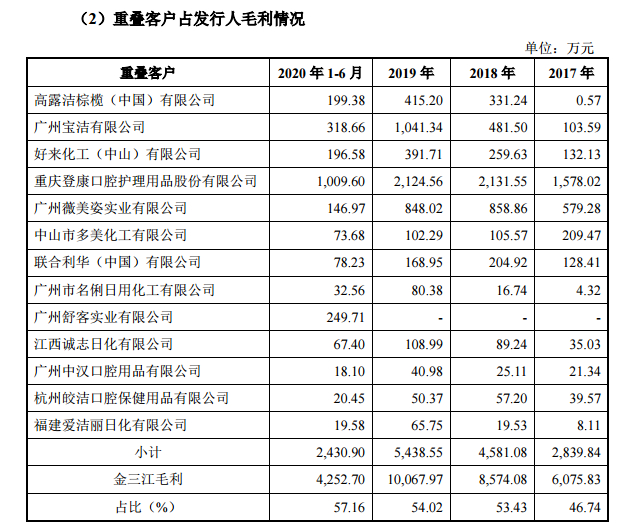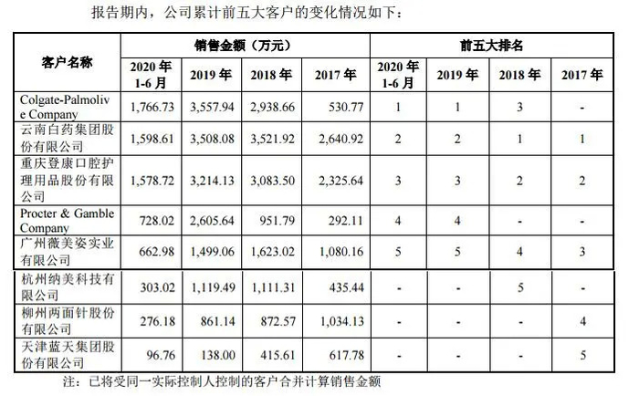 但机遇与风险并存。在所披露的招股书显示,2017年-2019年期间,金三江的前五大客户为Colgate-Palmoliv e Company(高露洁、黑人)、云南白药、重庆登康(冷酸灵)、Procter & Gamble Company(宝洁旗下佳洁士、欧乐 B)、薇美姿实业(舒客)。