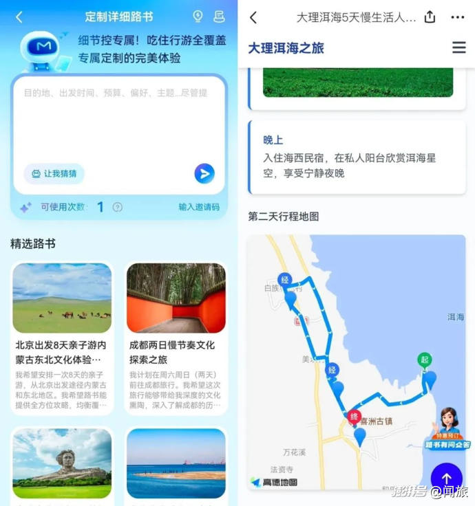 在该应用尚在内测期间,闻旅就曾试用过,在给出目的地名字和模糊的旅行需求后,AI路书会以选择题形式,向用户反向“发问”。