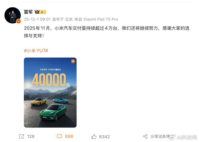 小米汽车:40,000,连续3个月超越蔚来、小鹏。