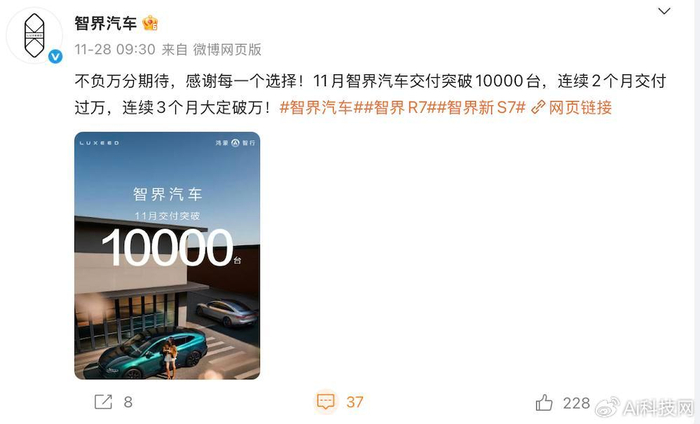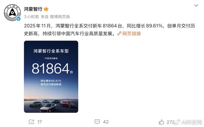 作为华为深度合作的生态联盟,鸿蒙智行在 11 月的表现堪称惊艳。根据最新数据,其月度交付量首次突破 8 万辆 大关,达到 8.19 万辆,创下了历史新高。