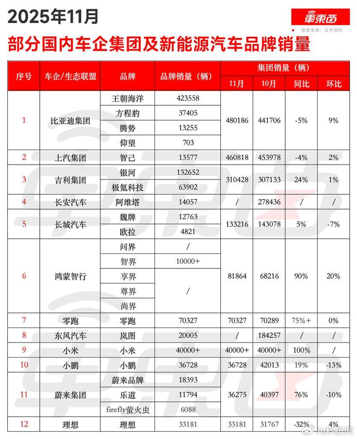 在刚刚结束的 11 月份,几家欢喜几家愁。鸿蒙智行以绝对优势领跑,而 零跑汽车 则凭借连续破纪录的表现稳居第一梯队。最引人注目的变化在于,小米汽车 的月销成绩已连续多月超越传统“蔚小理”三强中的两位。
